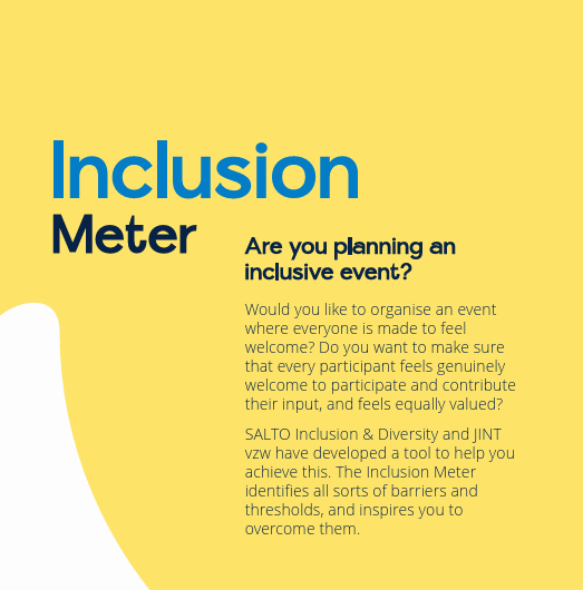 Unlock the Power of Priorities (disponibil în limba engleză aici)Acest material te ajută să înțelegi cum pot fi aplicate cele patru priorități ale programului Erasmus+ ideii tale de proiect, indiferent de sectorul în care lucrezi. Vă poate ajuta, de asemenea, să abordați aceste priorități în proiectele Erasmus+ și ESC. Fiecare proiect este unic și se bazează pe nevoile specifice ale participanților și organizațiilor implicate. Modul în care aceste priorități sunt implementate va varia, așadar, de la un proiect la altul. Acest material este realizat de centrele Salto Includere&Diversitate / Tineret, Green, Digital și Participation. Inclusion meter (disponibil în limba engleză, aici) Organizați un eveniment și vreți să vă asigurați că toată lumea se va simți binevenită? Vreți ca fiecare participant să contribuie și să se simtă la fel de apreciat? Puteți să vă pregătiți folosind acest instrument - Inclusion meter - dezvoltat de Salto Inclusion&Diversity și JINT vzw. Inclusion meter identifică diferite bariere ce pot apărea într-un eveniment și vă îndrumă pentru a le depăși. Puteți completa întregul test sau puteți alege o anumită secțiune. Dacă sunteți în căutarea unor sfaturi specifice (cum ar fi sfaturi care să vă ajute să vă pregătiți pentru un eveniment incluziv) sau dacă doriți să explorați cu atenție un anumit subiect (cum ar fi comunicarea), atunci puteți completa doar secțiunea respectivă. Dacă doriți să identificați toate barierele pe care le-ați putea întâlni atunci când organizați un eveniment, atunci invitația este de a completa întregul chestionar.